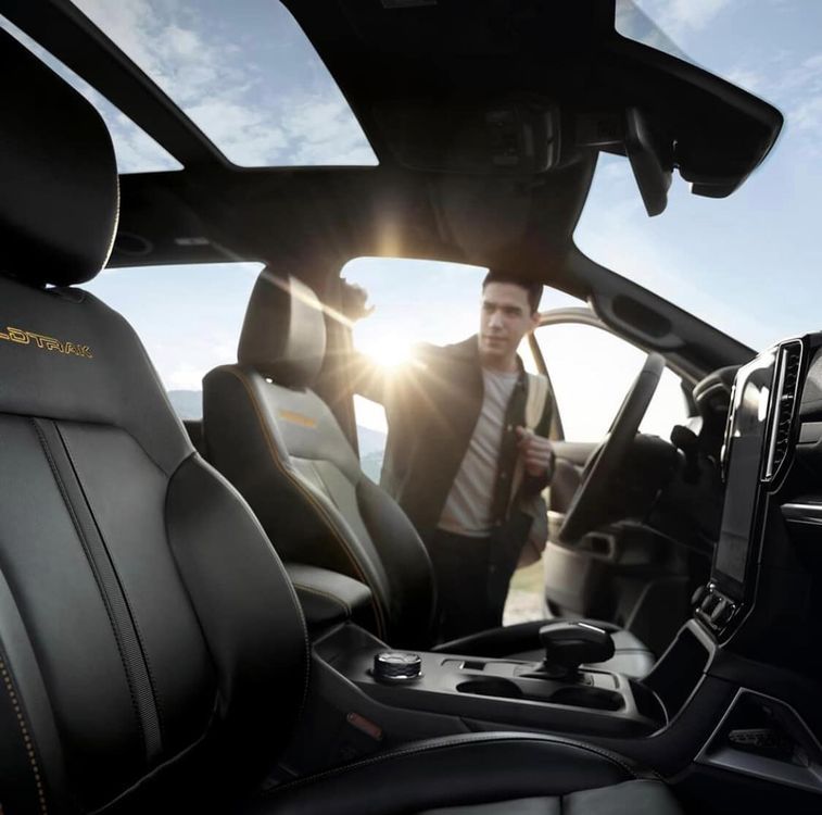 Ford Everest Wildtrak 2023 sở hữu khoang cabin có ghế ngồi được bọc da với tông màu đen điểm xuyết các đường chỉ màu cam, thêu logo Wildtrak. Trang bị trên xe bao gồm đồng hồ kỹ thuật số 12,4 inch, màn hình trung tâm 12 inch tích hợp hệ thống giải trí SYNC 4A có kết nối Apple CarPlay/Android Auto, 8 loa âm thanh, hàng ghế đầu chỉnh điện, điều hòa tự động, sạc điện thoại không dây, cửa sổ trời…